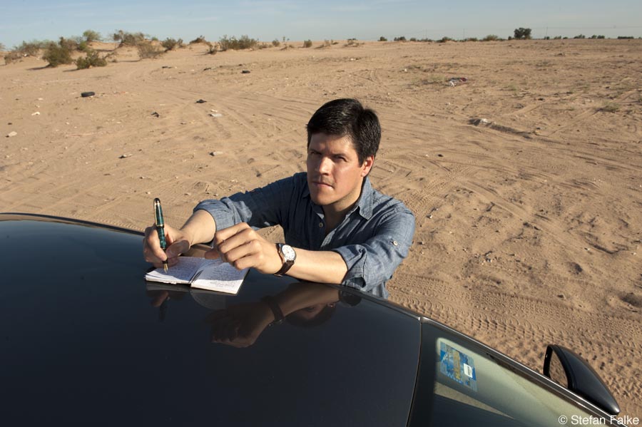 Mexican poet and essayist Jorge Ortega at the border fence in Mexicali, the state capital of Baja California. Ortega holds a PhD in Hispanic Philology from the Universidad Autonoma de Barcelona and he was inducted into the National System of Art Creators (SNCA) in the discipline of letters. He received the State Prize for Literature in Baja California in 2000 and 2004 in the genres of poetry and literary essays, respectively, and the Tijuana National Poetry Prize in 2001 and in 2005. He won many other awards for his poetry.