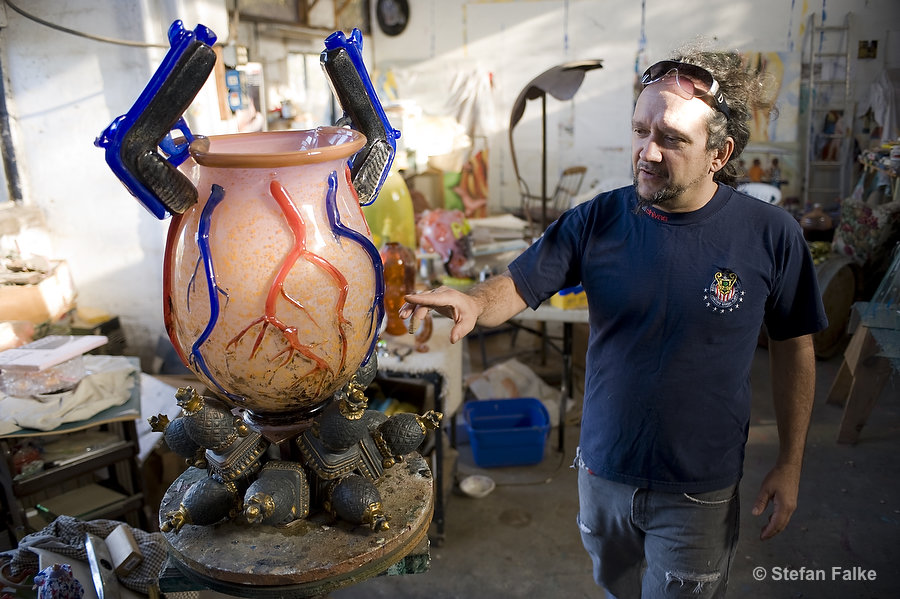 Glas blowing artist Einar De La Torre in 2008 at his studio near Ensenada which he shares with his brother Jamex de la Torre. The brothers live and work on both sides of the San Diego-Baja California border. Their fantastic glas sculptures have been exhibited internationally. The next show is very soon: Einar and Jamex de la Torre / Microcosmos at Traver Gallery, Sept 6 – 30. Opening Reception: September 6th, 5-8pm.