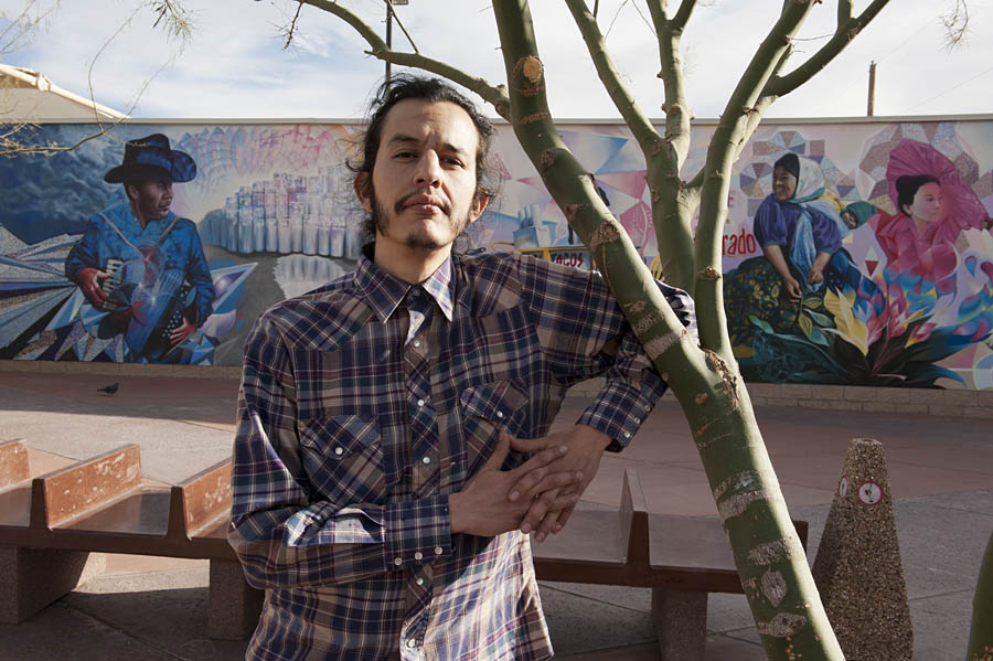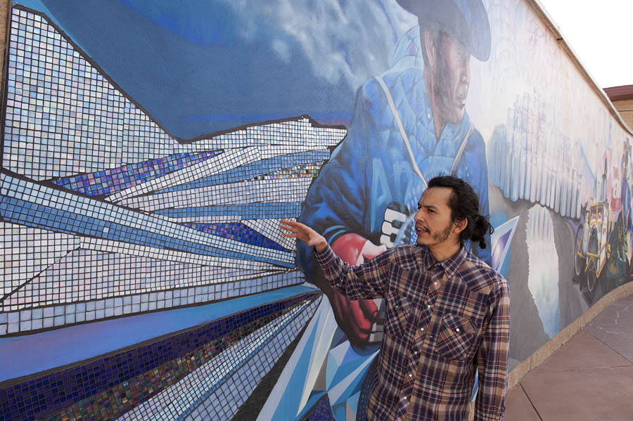 Muralist Werc Alvarez in front of his mural (90 feet long,11 feet tall) at the entrance to the Stanton Bridge which connects El Paso, USA, with Ciudad Juarez, Mexico. His work: http://wercworldwide.com/