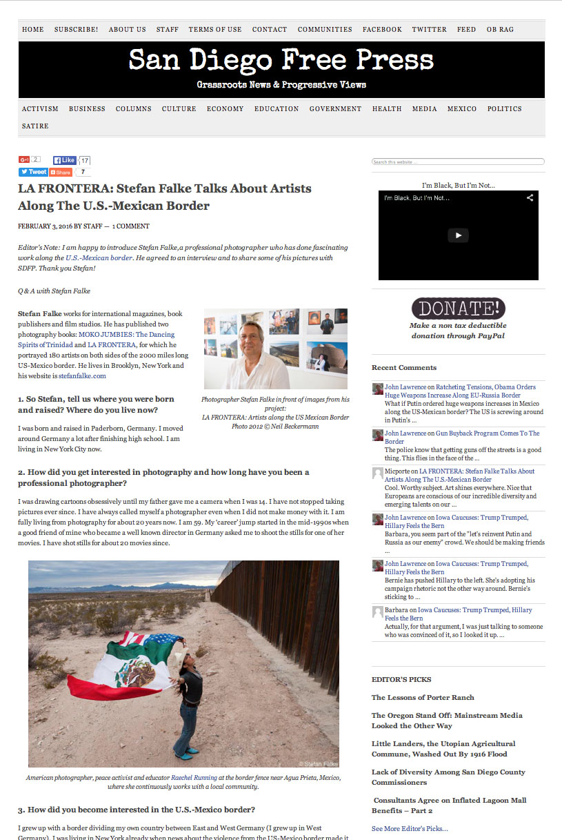 Read Barbara Zaragoza‘s interview with me about the La Frontera project: http://sandiegofreepress.org/2016/02/la-frontera-stefan-falke-talks-about-artists-along-the-u-s-mexican-border/